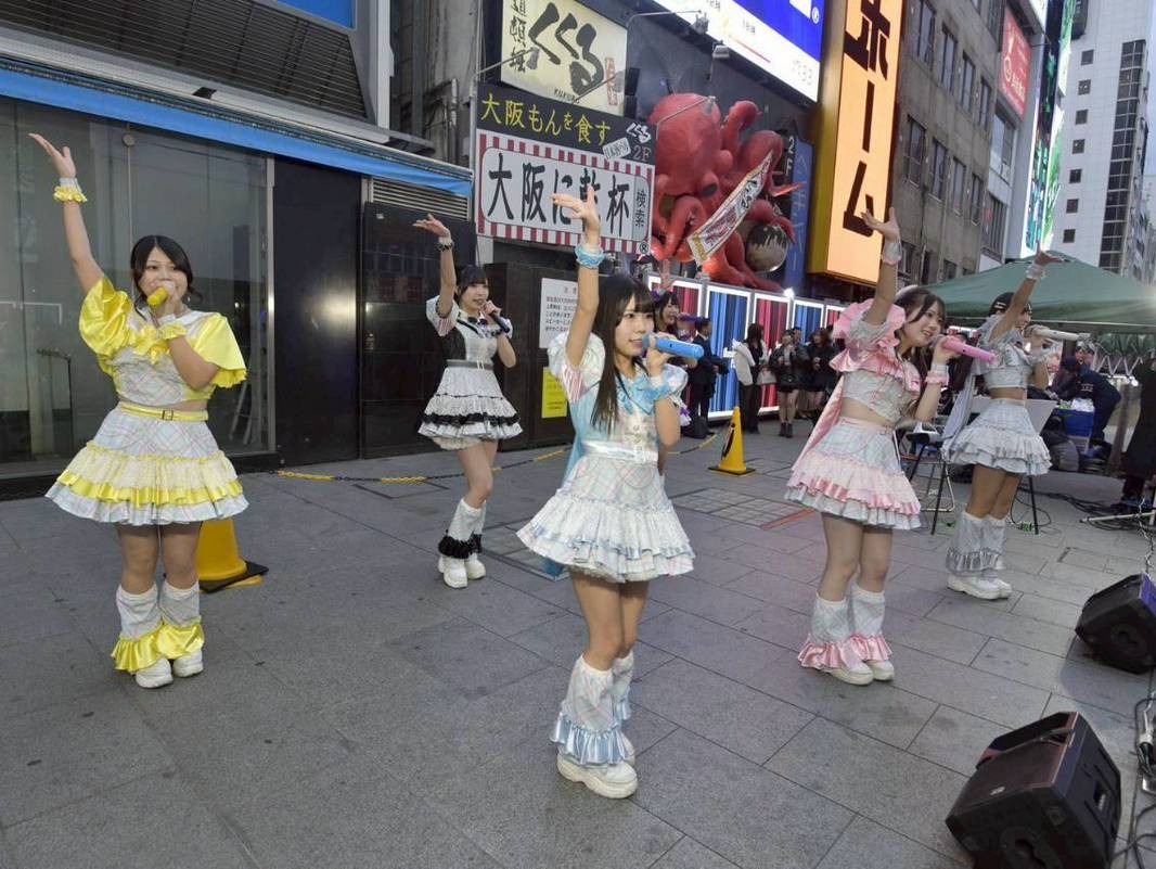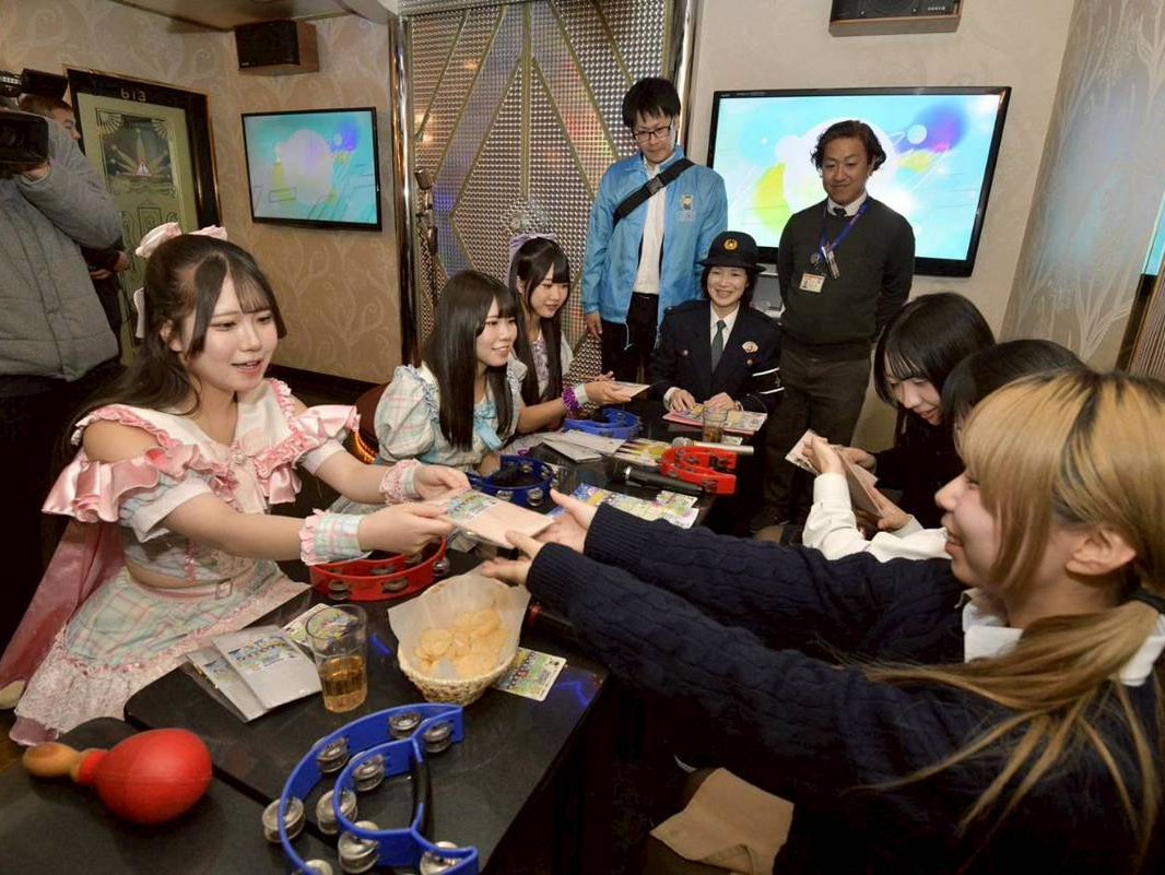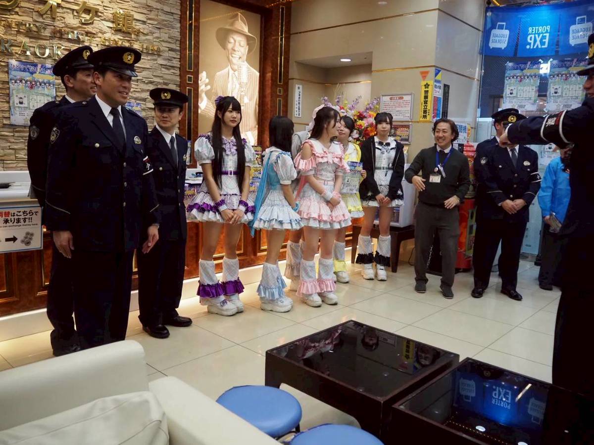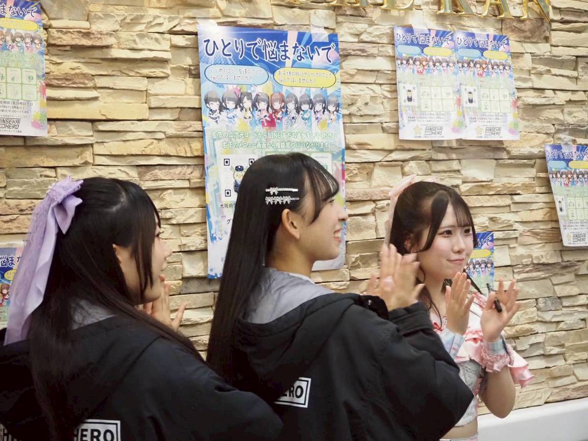 カラオケ館戎橋本店で開かれたイベントには、ミナミのご当地アイドル、シンセカイヒーロー「大阪府警察少年相談アンバサダー」が登場。