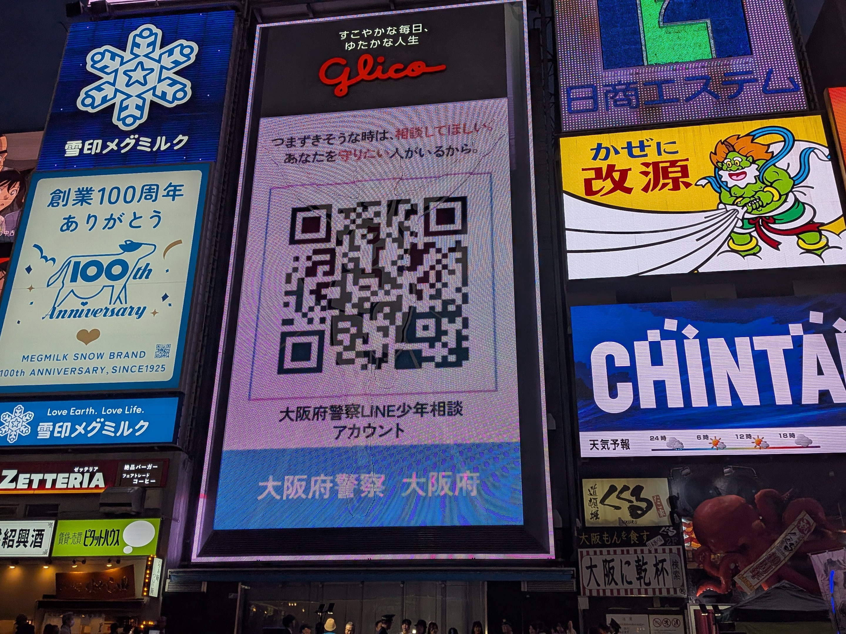 江崎グリコ(株)様協力の下、18時になると「グリコ看板」が相談窓口に誘導する「二次元コード」の表示に変わりました。
